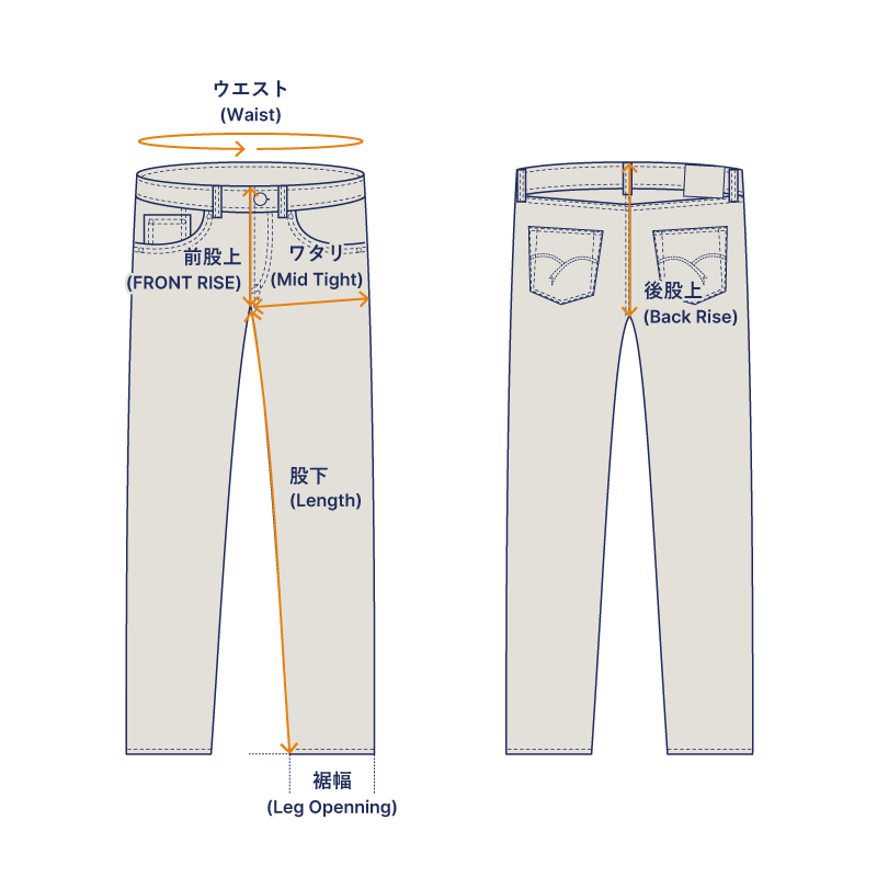 | サイズ表記 | ウエスト | 前股上 | 後股上 | ワタリ | 裾幅 | 股下 |