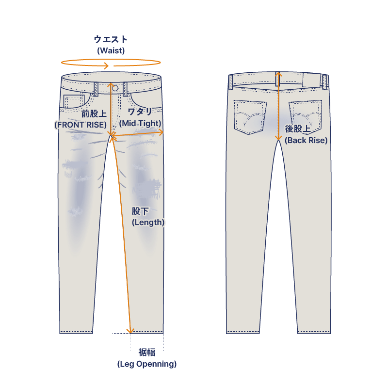 | サイズ表記 | ウエスト | 前股上 | 後股上 | ワタリ | 裾幅 | 股下 |