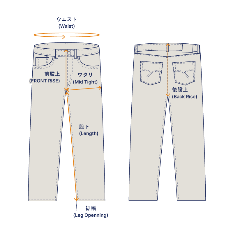 | サイズ表記 | ウエスト | 前股上 | 後股上 | ワタリ | 裾幅 | 股下 |