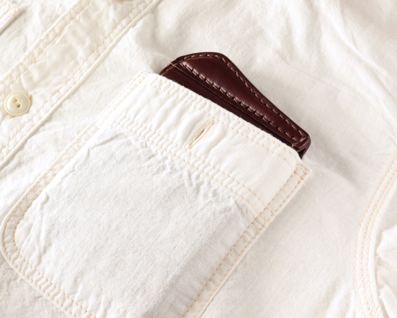 シャツなどの胸ポケットにもしっかりと収まるサイズ感で、収納場所を選ばずに使用可能です。折り返し部分には特徴的な飾りが施されており、見た目のアクセントになっているのはもちろん、収納時にはウォレットの出し入れをしやすくする実用的な要素でもあります。