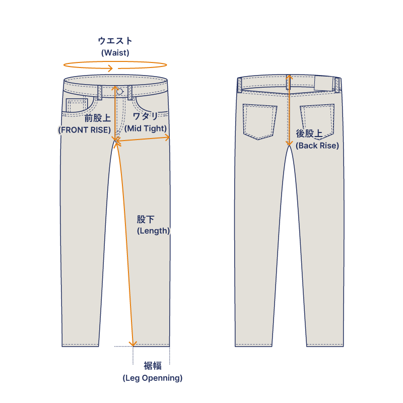 | サイズ表記 | ウエスト | 前股上 | 後股上 | ワタリ | 裾幅 | 股下 |