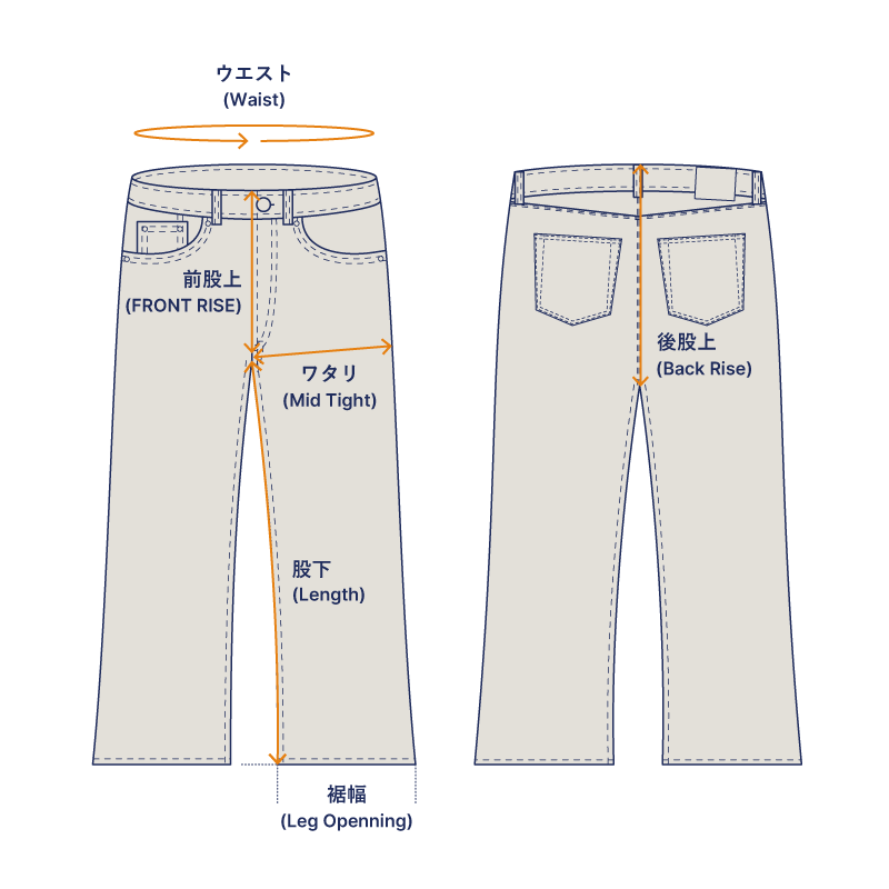 | サイズ表記 | ウエスト | 前股上 | 後股上 | ワタリ | 裾幅 | 股下 |