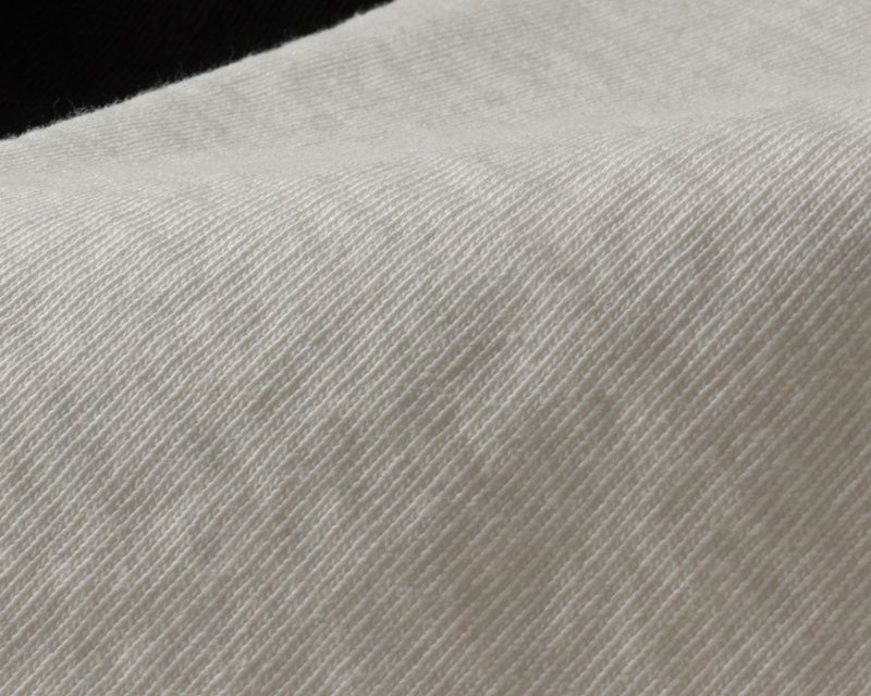 太い番手の糸に空気の渦の力で撚りを加える「空紡糸」を使用。糸表面には強い撚りが加わりシャリっとした硬めな仕上がりですが、糸の中心はやわらかくフワッとしているのが特徴です。 ヘビーオンスの重厚感が楽しめ、着用を経て着心地の良さも味わえます。