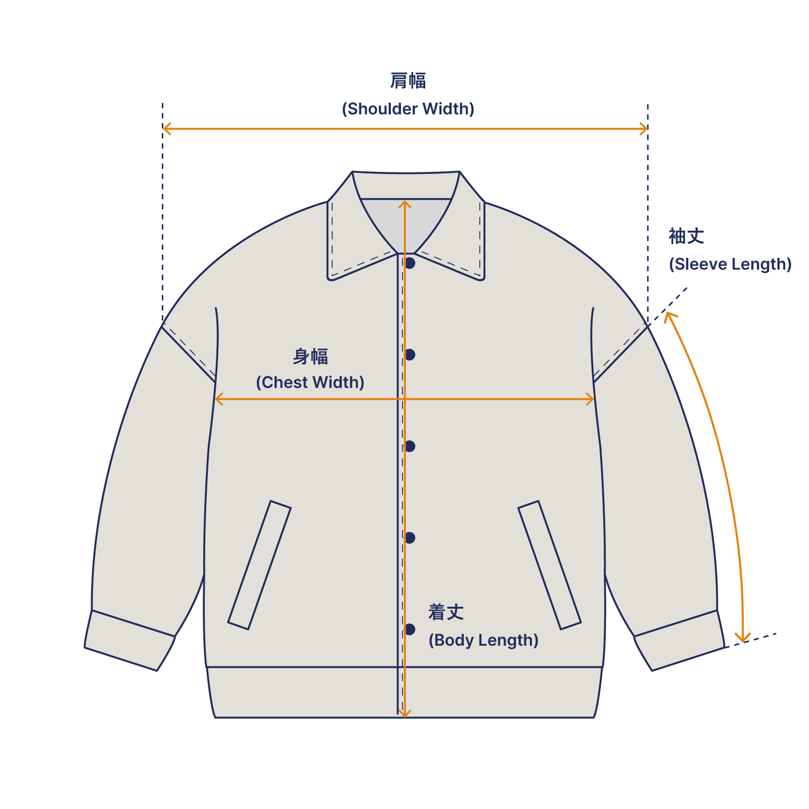 前立てやカフス部のボタンにはブランドネーム入りのオリジナルドットボタンを使用。 ボディカラーに統一したパーツにすることでジャケットのシンプルさを際立たせています。