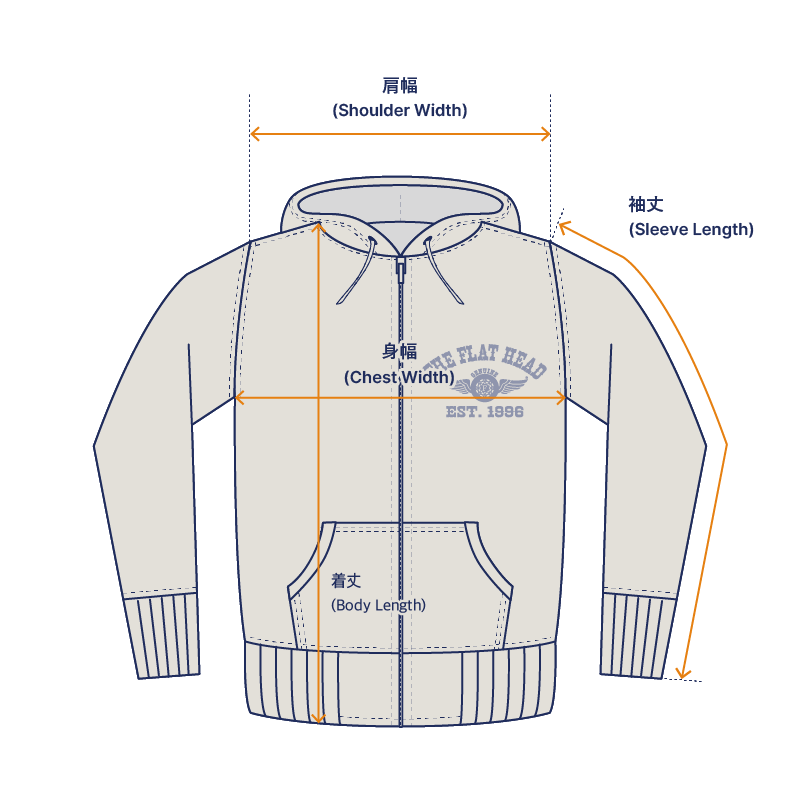 左胸と背中にプリントされたフライングホイールはフラットヘッドの象徴するデザイン。吊り生地の軽くやわらかな質感は着心地も良く、羽織物としてはもちろん、重ね着にもオススメのパーカーです。