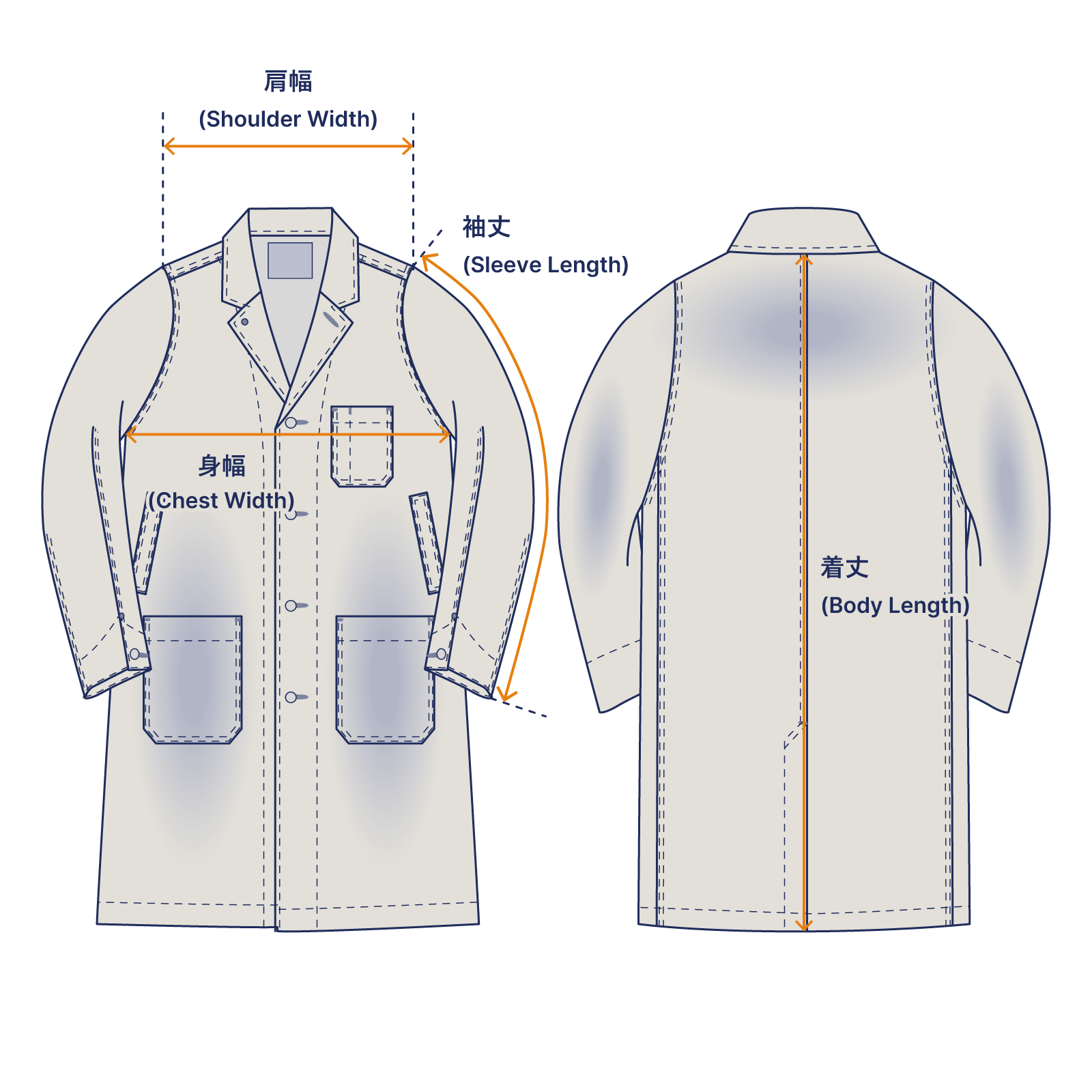 腹部には貫通式のスラッシュポケットが備わっています。 これは上着を着たままインナーのポケットから収納物を出し入れするための構造で、ヴィンテージのショップコートにも見られたディテールです。 寒い季節はスウェットやネルシャツとの重ね着でも、コートの前を開けることなくインナーのポケットから収納物を取り出せます。