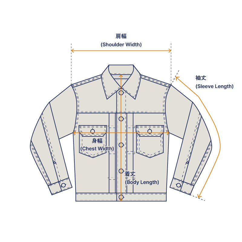 ・14.5ozデニム(旧式シャトル織機)・チェーン刺繍・鉄製ボタン・革パッチ(鹿革)・主要部巻き縫い・ワンウォッシュ・カラー:ブルー ・サイズ:36(S) / 38(M) / 40(L) / 42(XL) / 44(XXL)