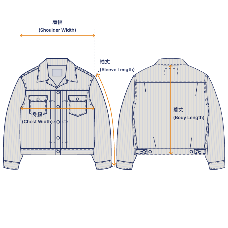 ・COTTON100% ・10.2ozヒッコリー(旧式シャトル織機)・鉄製ボタン・オリジナル銅リベット・主要部巻き縫い・革パッチ(牛革)・ワンウォッシュ・カラー:ブルー×ホワイト・サイズ:36(S) / 38(M) / 40(L) / 42(XL) / 44(XXL) / 46(XXXL) / 48(XXXXL)※サイズ46(XXXL)、48(XXXXL)は背面割仕様
