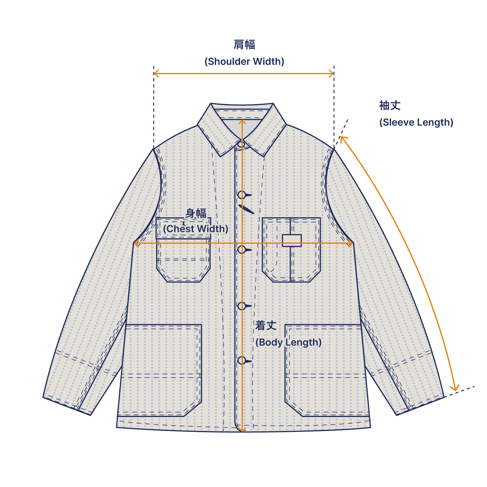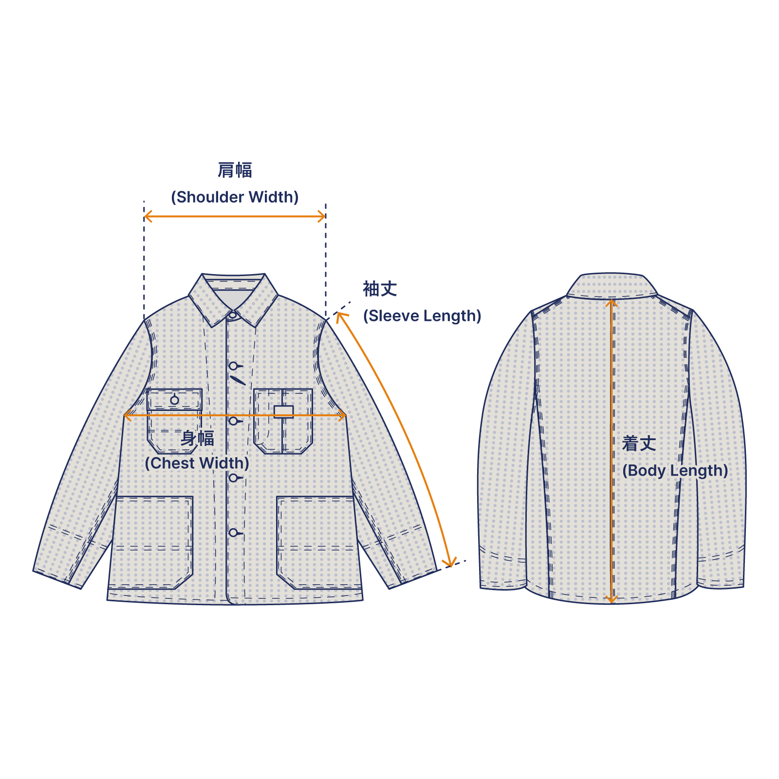 ・10ozデニム(旧式シャトル織機)・ドット抜染・真鍮ボタン・主要部巻き縫い(トリプルステッチ)・ワンウォッシュ・カラー:ブルー・サイズ:36(S) / 38(M) / 40(L) / 42(XL) / 44(XXL)