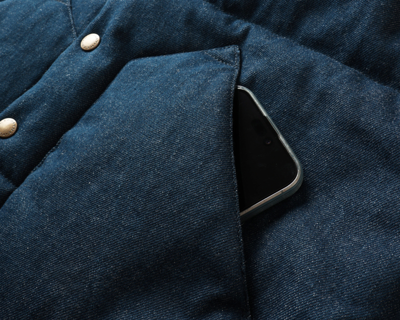 表地には天然藍染めのデニム生地を使用。 旧式のシャトル織機で織り上げたムラ感のある表情と天然藍の独特な青みの強い色合いが楽しめます。 柔らかな印象を与える本藍デニム生地はベストのカジュアルな印象をより引き立てています。