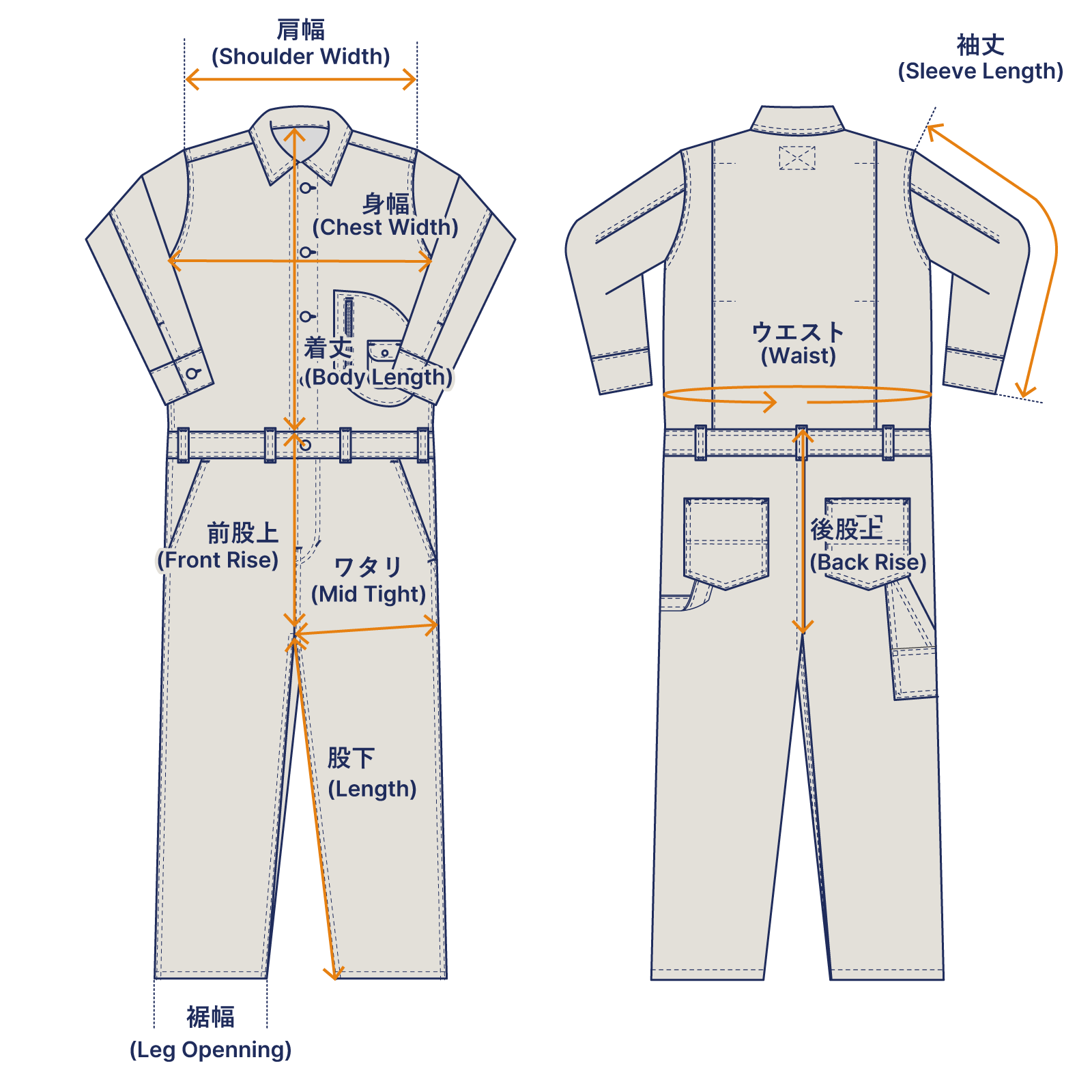 | サイズ表記 | 着丈 | 肩幅 | 身幅 | 袖丈 | ウエスト | 前股上(帯込) | 後股上(帯込) | ワタリ | 裾幅 | 股下 |