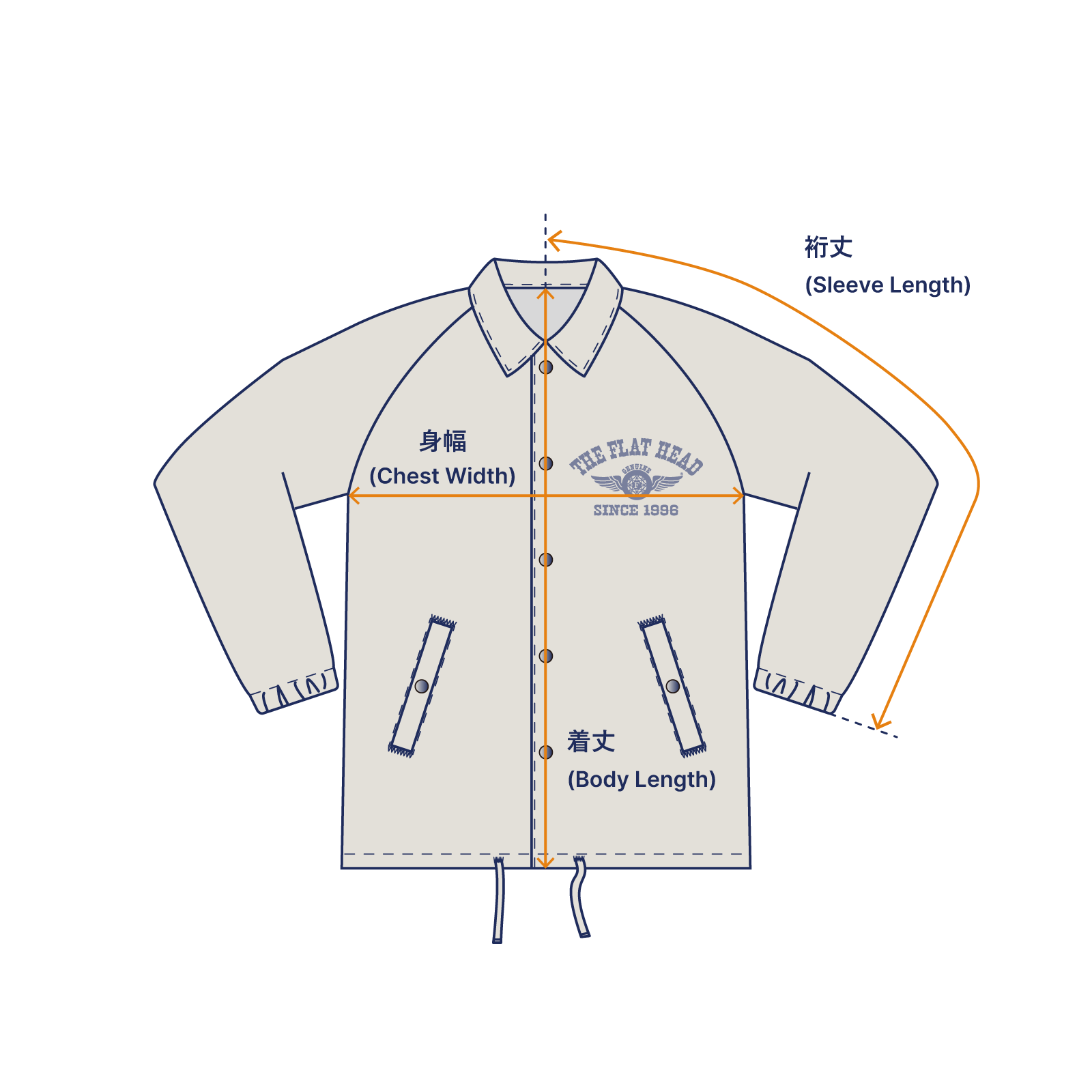 ボタンにはブランドネーム入りのオリジナルドットボタンを使用。 メタルボタンなので、着用を重ねていくことで擦れなどによる表情の変化も楽しめます。