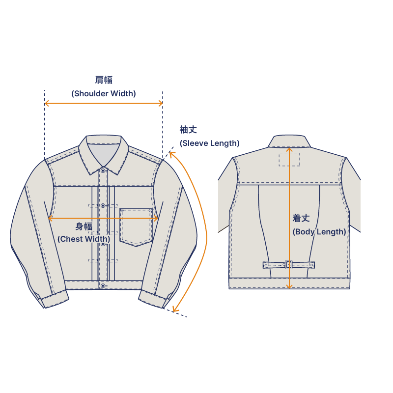 ・COTTON100% ・12ozデニム生地(旧式シャトル織機)・鉄製ボタン・主要部巻き縫い・革パッチ(牛革)・ワンウォッシュ・カラー:ブルー・サイズ:36(S) / 38(M) / 40(L) / 42(XL) / 44(XXL) / 46(XXXL) / 48(XXXXL)※46 / 48インチは背面割仕様です