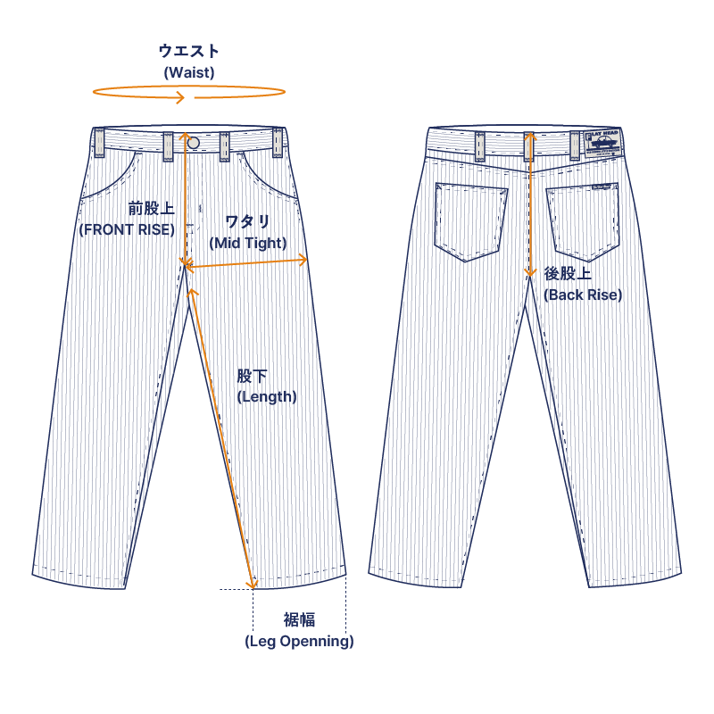 負荷のかかる部分は巻き縫いを行い、強度を高めています。 チェーンステッチなので穿き込むことでパッカリングが起き、独特な色落ちをするので、経年変化も楽しめます。