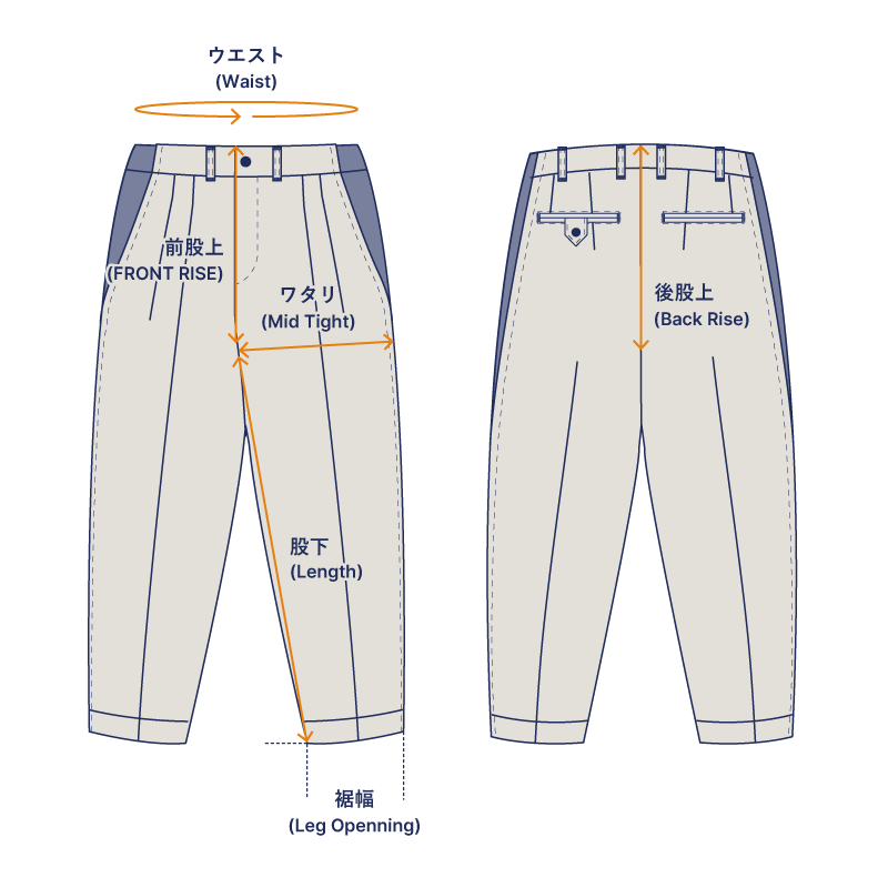 腰元はツータックになっていてゆったりとした太めのサイジングに仕上げています。 裾に向かってテーパーさせることで、腰元のゆとりを感じさせないスッキリとした見た目で穿いていただけます。