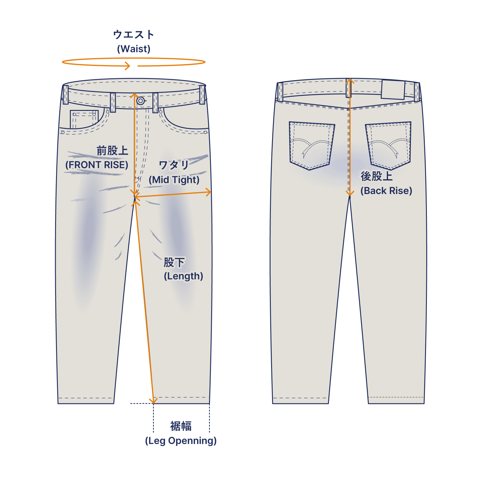 | サイズ表記 | ウエスト | 前股上 | 後股上 | ワタリ | 裾幅 | 股下 |