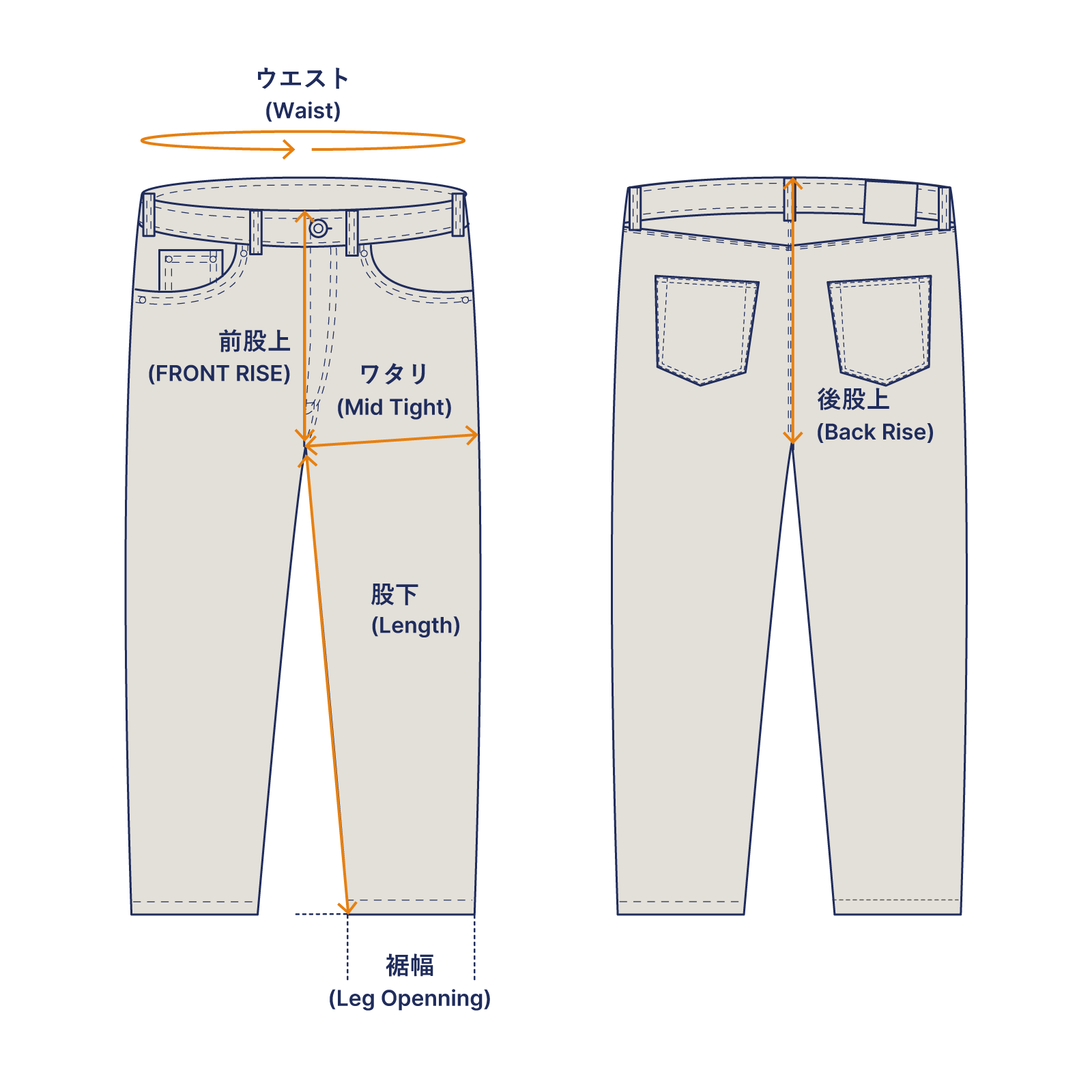 | サイズ表記 | ウエスト | 前股上 | 後股上 | ワタリ | 裾幅 | 股下 |