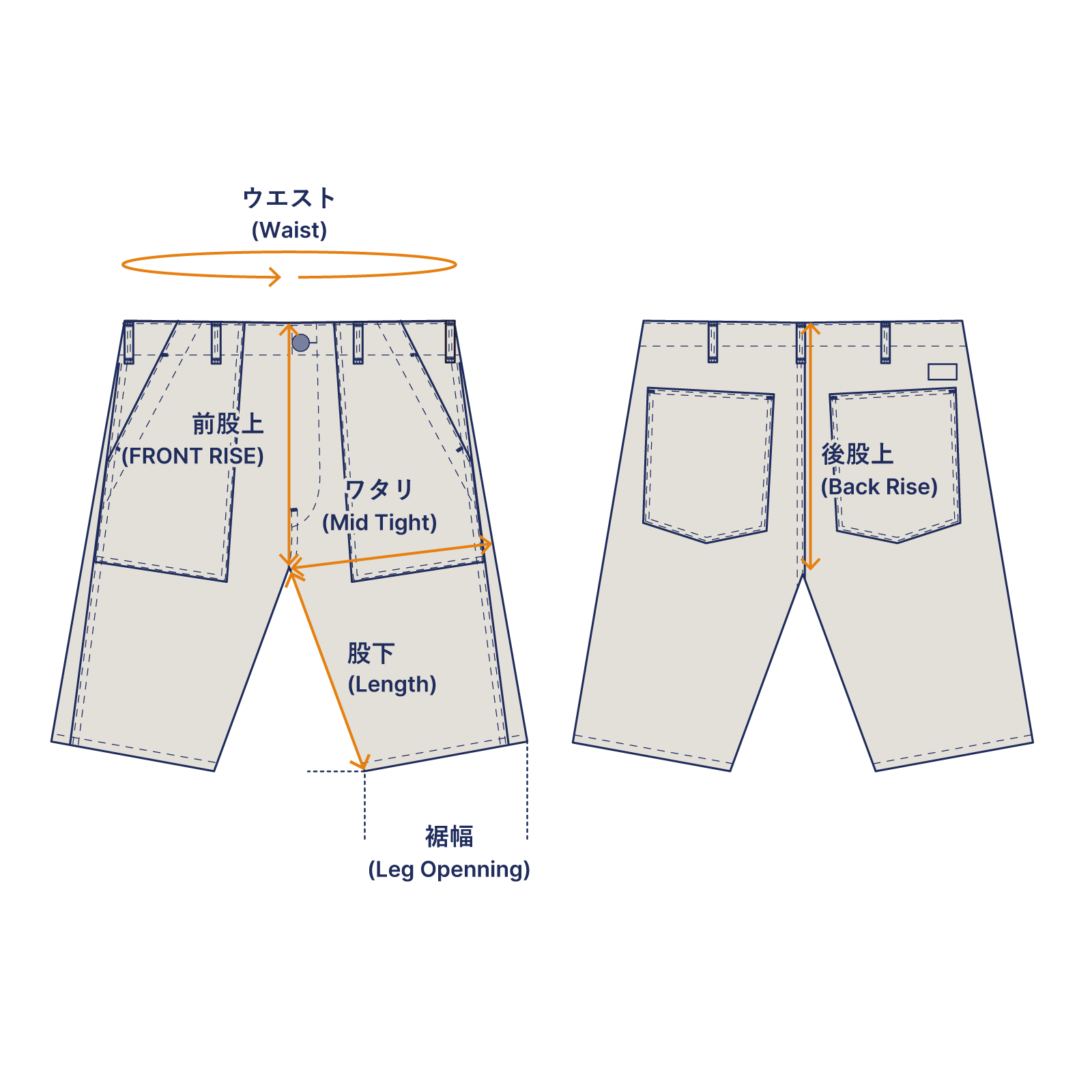ミリタリーパンツとして人気の高いベイカーパンツをベースに、特徴的な縦長のパッチポケットなどのディテールを取り入れつつ、厚手のデニム生地を使用することで硬くごわつきが出やすい、バックポケットのフラップやウエストアジャスターを排することで、ストレスなく穿きやすいハーフパンツに仕上げました。