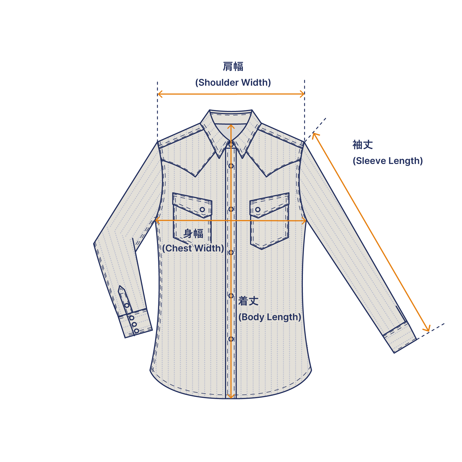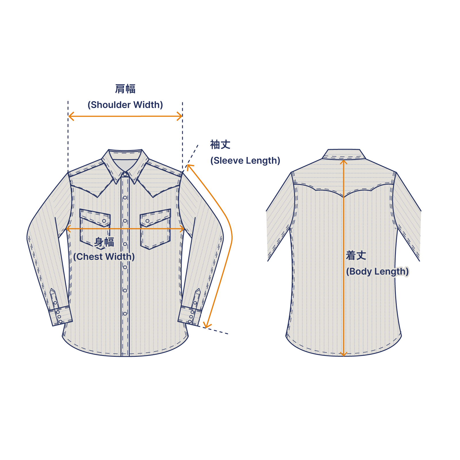 ウエスタンシャツの特徴的なディテールでもるウエスタンヨーク部分は、生地を90度傾けてボディ部分との見た目を換えています。 両胸のポケット部分はフラップを含めストライプ柄を柄合わせすることでボディに溶け込ませています。 パーツごとに生地の使用方法を変える遊び心のあるデザインです。