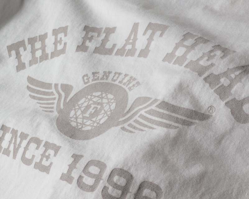 フラットヘッドのTシャツの最大の特徴ともいえる首元の縫製技法。 実在するヴィンテージTシャツの縫製から着想を得て、独自に改良を行った「3本針の1本外し縫製」は伸びやすい首元に20番手の太いコットン糸を使用しています。 更にリブに2本、ボディに1本の合計3本のステッチで縫い上げることで、縫製技術とコットンの性質を利用し首元が伸びにくいTシャツを実現しました。 長年の着用でも首回りの伸びが出にくく、お気に入りのデザインを末永く楽しんでいただけます。