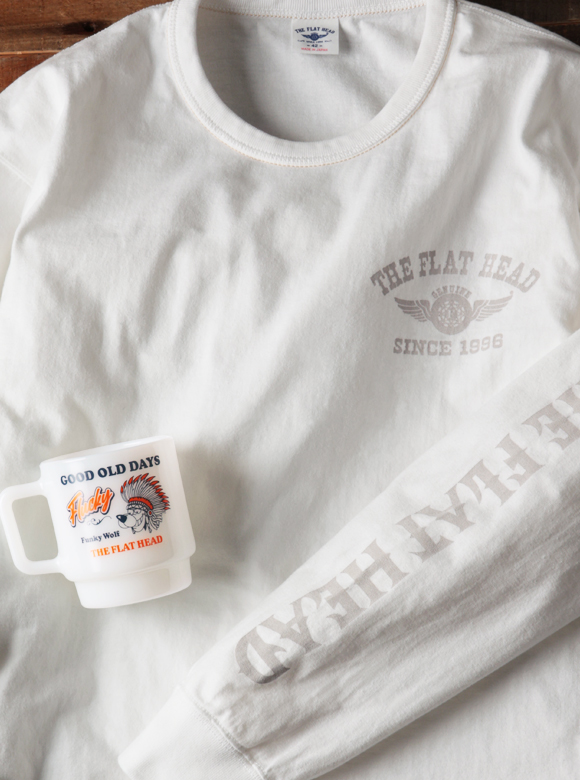 【ロングスリーブTシャツ】・COTTON100%(度詰丸胴)・ネック部:3本針の1本外し(20番綿糸)・プリント技法:染み込みプリント・ワンウォッシュ・カラー:ホワイト・サイズ:38(M) / 40(L) / 42(XL) / 44(XXL) / 46(XXXL)「タイトな身幅」と「ショート丈」のフラットヘッドを代表するTシャツ「THCシリーズ」のロングスリーブTシャツ。購入の際はサイズガイドをよくご確認ください。【マグカップ】・材質:ホウケイ酸ガラス・サイズ:高さ 92mm 上口径 80mm・容量:290ml・重さ:340ℊ※一部表面に白く線状の模様が見える場合がございます。 これは製造時のガラスの温度差によって入るもので、ハンドメイド特有の風合いです。品質には問題ございません。 ※耐熱ガラスではございませんが、熱いお湯を注ぐことは可能です。 ヴィンテージミルクガラスと同様のお取扱いをお薦めします。 【ご使用上の注意】 ・電子レンジ、食器洗浄機のご利用はできません。 ・急激な温度差を伴うご使用はお避けください。