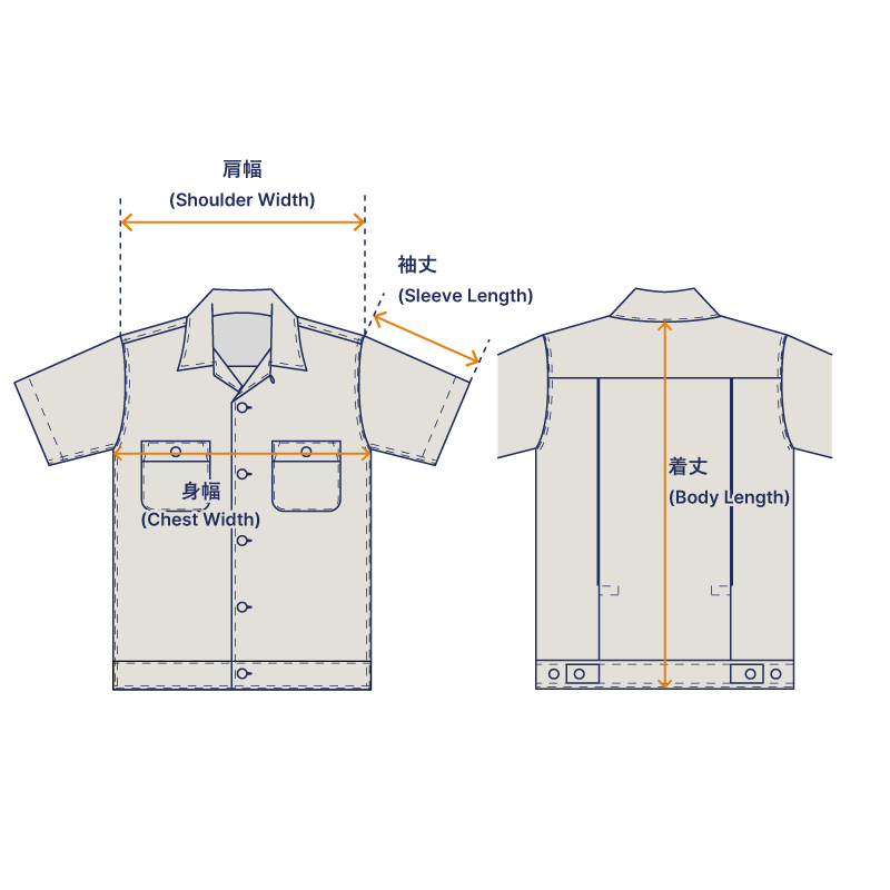 ・RAYON100%(旧式シャトル織機)・チェーン刺繍・尿素ボタン・主要部巻き縫い・ワンウォッシュ・カラー:アイボリー / ブラック・サイズ:36(S) / 38(M) / 40(L) / 42(XL) / 44(XXL)