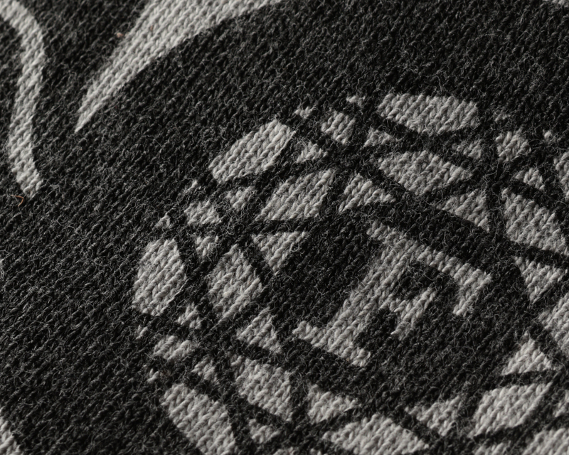 ・COTTON100% ・吊り編み生地・ネック部:2本針両振り縫製・主要部フラットシーマ(4本針扁平縫い)・プリント技法:染み込みプリント(グレー)、抜染プリント(ブラック)・ワンウォッシュ・カラー:ブラック / グレー・サイズ: 38(M) / 40(L) / 42(XL) / 44(XXL) / 46(XXXL)