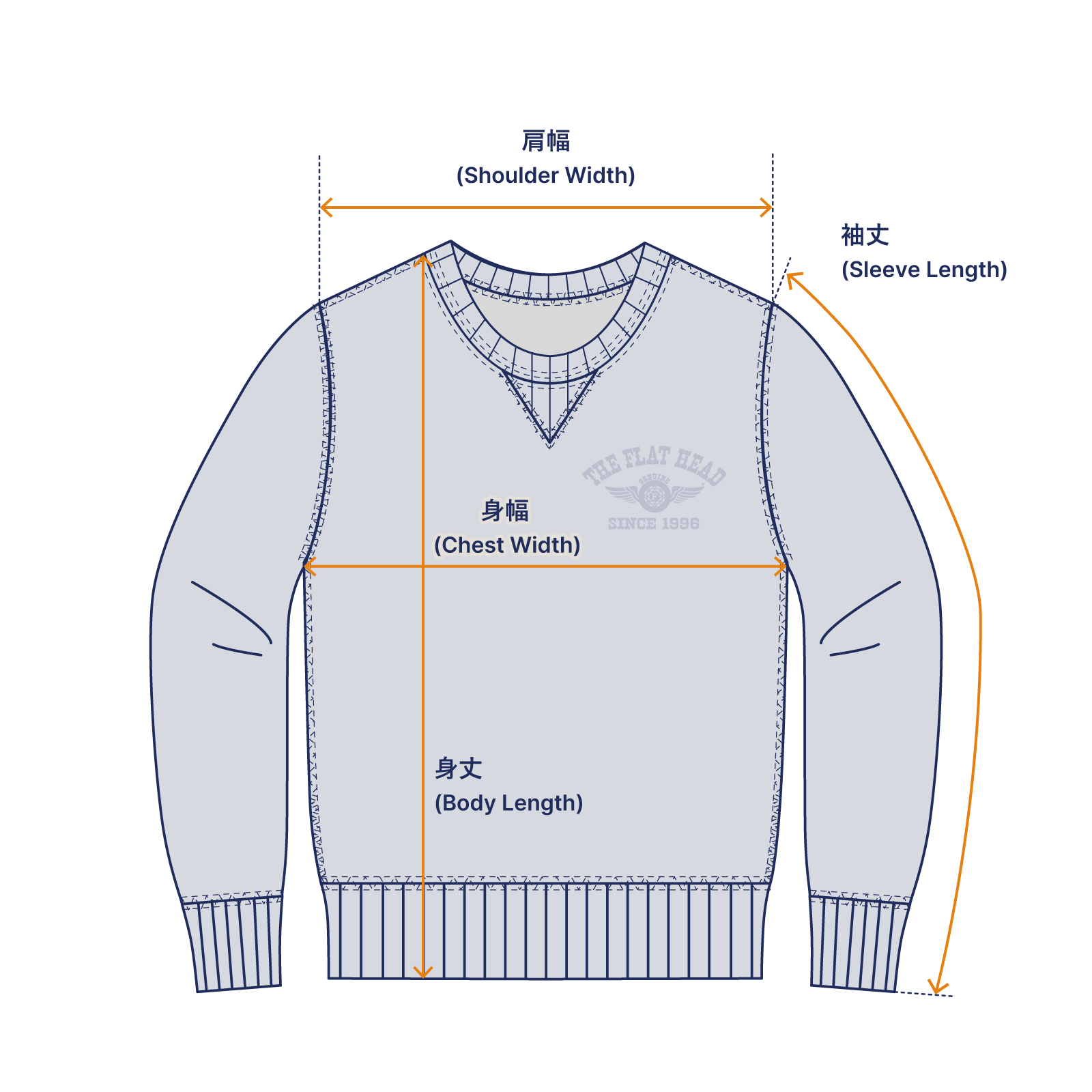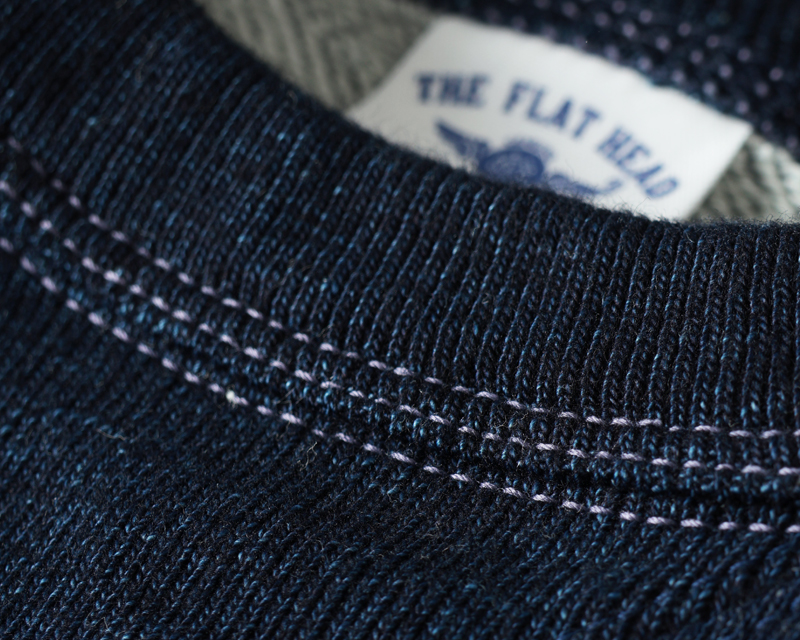 【インディゴで染め上げた経年変化が楽しめるクルーネックスウェット】 ロープ染色で染め上げた糸を使用し編み上げたスウェット生地を使用したクルーネックスウェット。 フロントのワンポイントと背中にプリントされたブランドアイコンのフライングホイールが目を惹くデザインです。 Vガゼットなどのヴィンテージライクなディテールにフラットヘッド独自の縫製技法「3本針の1本外し」でネック部分を縫製するなど独自性も落とし込んだ作りです。