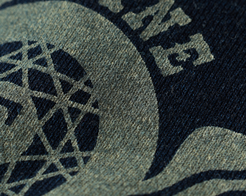 左胸と背中にプリントされたブランドアイコンとしてもお馴染みのフライングホイール。 濃色にインディゴ染めされた生地にしっかりとプリントを行うために、抜染プリント技法を採用。 プリント部分を脱色し染料を染み込ませるため、濃色の生地にもしっかりと柄がプリントされます。 生地内部まで染料がしっかりと染み込むので、生地の色落ちが進んでもプリントはしっかりと残るのも抜染プリントの魅力です。