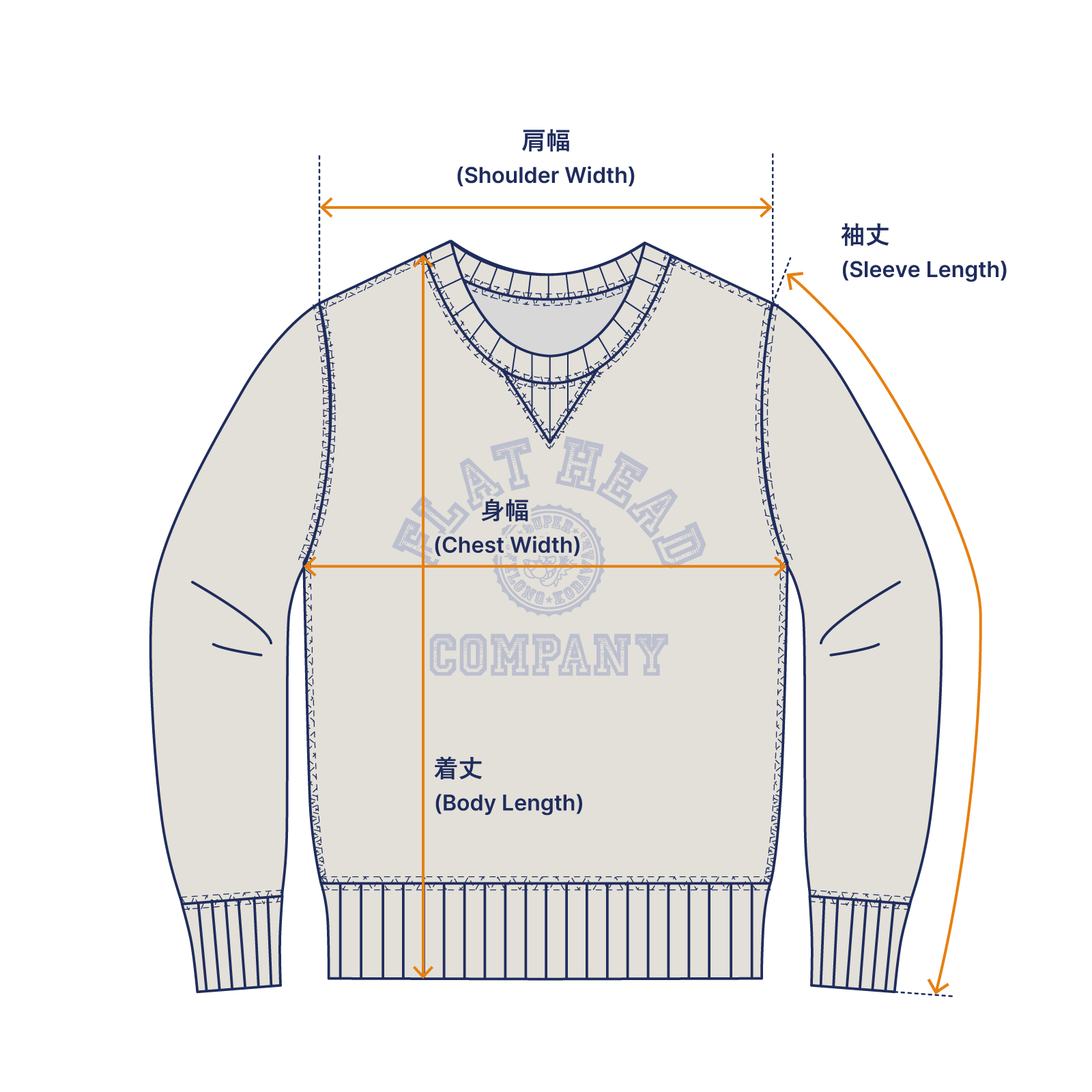 太番手の糸を使い編み上げたオリジナル生地を使用。 フラットヘッドで従来使用する糸よりも太い糸で編み上げることで、程よい生地の肉感とコシを出しています。裏面は裏起毛加工をほどすことで保温性が高く、吊り生地の持つフワッとした柔らかさをより引き立てています。 肉厚でコシがありながらも軽く柔らかな着心地が楽しめます。