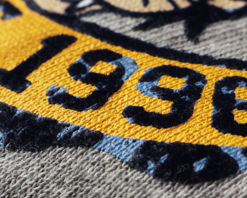 ラバープリントの上に短い繊維を植毛し仕上げるフロッキープリントを施し、ヴィンテージスウェットのプリントのような擦れ感を表現しています。 フロッキープリントのフワッとしたボリューム感と下地のラバープリントが顔を覗かせている部分の立体感は、実際の着用により擦れたようなリアルな雰囲気を醸し出しています。