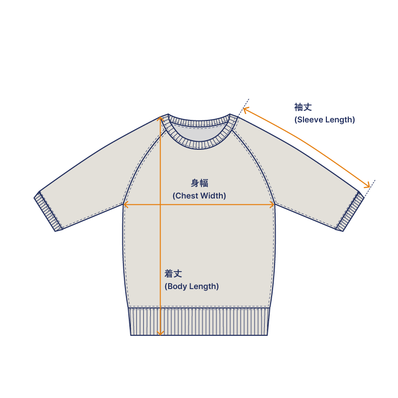襟ぐりから袖下にかけて斜めに袖を縫い付けた形状のラグランスリーブ。 スポーツウエアなどにもよく使われている形状で、腕を動かしやすいのが特徴です。 ラグランスリーブにすることで肩や腕の動作がしやすいのスウェットに仕上げています。
