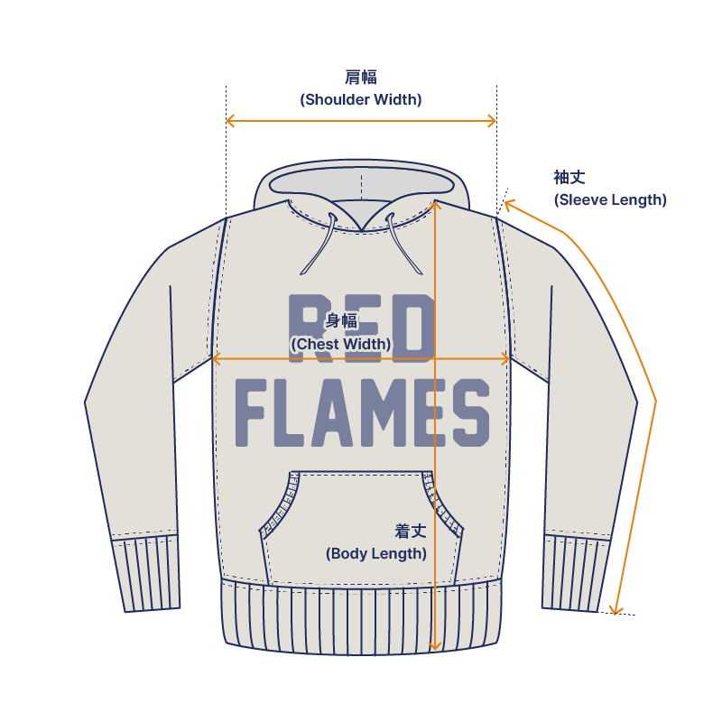 一見フロントプリントでカレッジ風にも見えますが、バイクや車のカスタムペイントで良く見かけるファイヤーパターンの意味を持つ「RED FLAMES」というワードをプリントしています。ボディと相性の良いプリントカラーをチョイスし、グレーには染み込み、ブラック、ネイビーには抜染でプリントしています。
