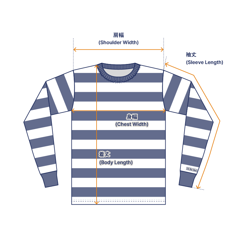 全てのサイズで、首元と袖の合わせ部分のボーダー柄スタート位置を統一しています。 リブとボーダー柄の位置や、袖の配色パターンがズレることで、見た目の印象も大きく変わってしまうため、全てのサイズが同様の位置からスタートするようにパターンを合わせています。
