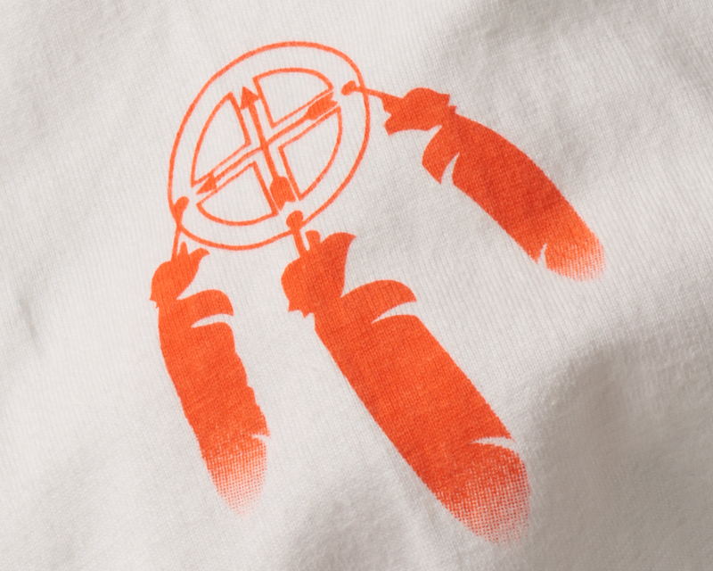 右袖にはブランド初期モデルで採用されていたメディスンホイールとフェザーを組み合わせたデザイン。 フェザーの先端にはグラデーションを施すことで、立体感を感じさせる仕上がりにしています。