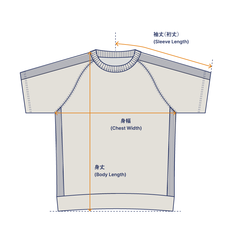袖はラグランスリーブを採用しています。 ラグランスリーブは動きやすさを求めた袖形状ですが、今回はよりカジュアル感を高めるデザイン的な要素として採用しています。 抜け感のあるカジュアルな見た目と、柔らかな生地感とゆったりとしたサイズ感でラフな着こなしにおすすめな1着です。
