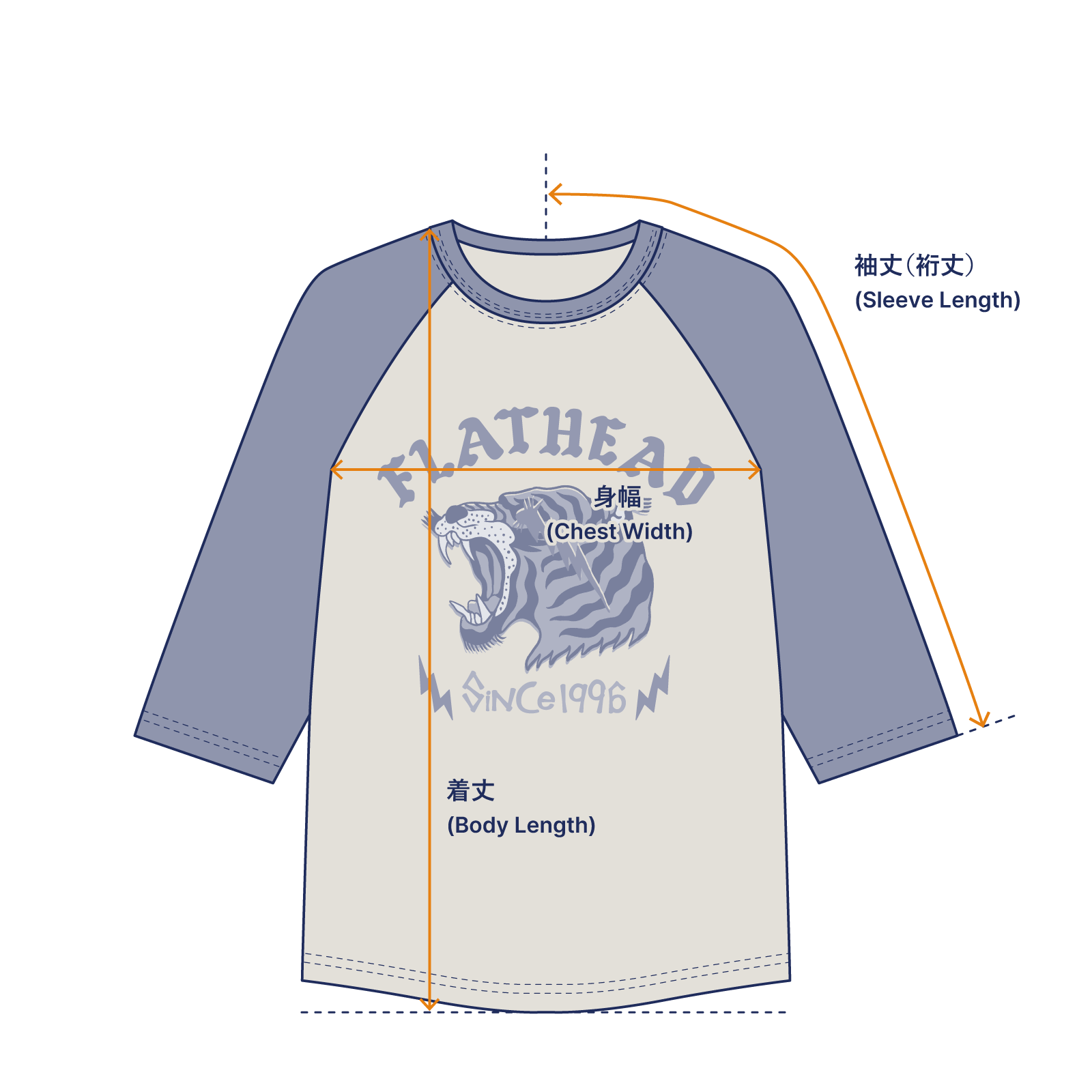 フロント面に大きくプリントが配されたクオータースリーブTシャツ。 ボディにはフラットヘッドを代表するTHCボディを使用し、タフな着用にもおすすめです。 フラットヘッドらしい3本針の1本外し縫製はもちろん、ラグランスリーブやカーブした裾部分などディテールにもこだわりを落とし込んでいます。