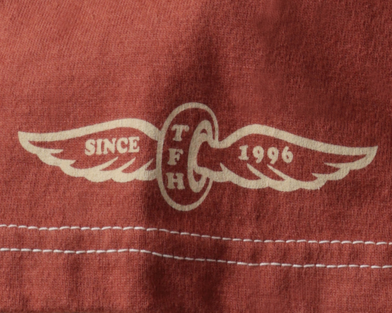 バック面にはアーチ状の「THE FLAT HEAD」ロゴとフライングホイール、そして「Motor Vibes」のレタリングを大胆にレイアウト。