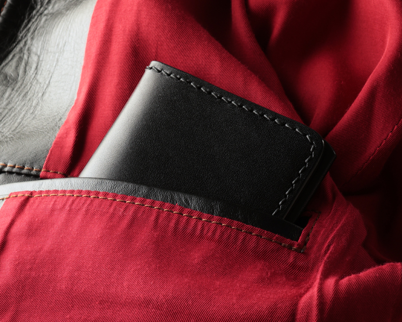 縫いは全箇所手縫いで仕上げています。 手縫いらしい糸の存在感とシンプルな外観を損なわない見た目のバランスを考慮し、縫いに使用する糸も工房で加工を行い作成。 ウォレットの魅力を引き出すための職人の細やかな心遣いが伺えます。