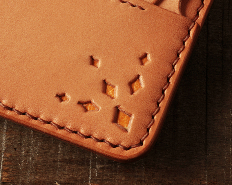 札入れ部分をはじめとする内装の内側はアメ豚のオール貼り合わで仕上げています。 革の伸びなどによる型くずれ軽減効果と、鮮やかなイエローのアメ豚はウォレットを開いた際に目を惹きます。 カードケース部分にはダイヤ柄の切り抜きもあり、イエローの豚革を活かしたデザインです。