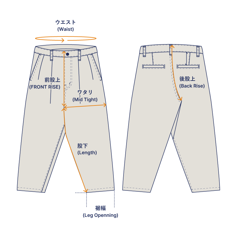 トップボタンには月桂樹柄のデザインされたドーナツボタンを使用。 ジャケットと共通のパーツを使用し統一感を出しているのでセットアップの着用もおすすめです。フロントはジッパーフライになっていてUNIVERSAL ZIPPERを使用しています。