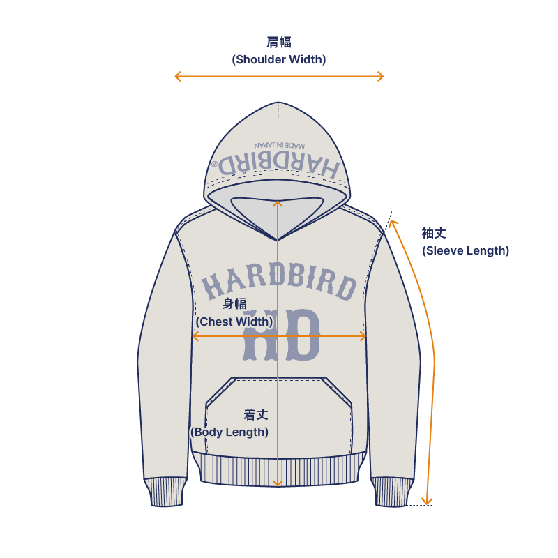 フロントと、フード部分にそれぞれプリントされたHARDBIRDのブランドロゴ。 ラバープリントを採用することで、プリントに力強さとボディカラーとのメリハリが生まれ、存在感が際立ちます。
