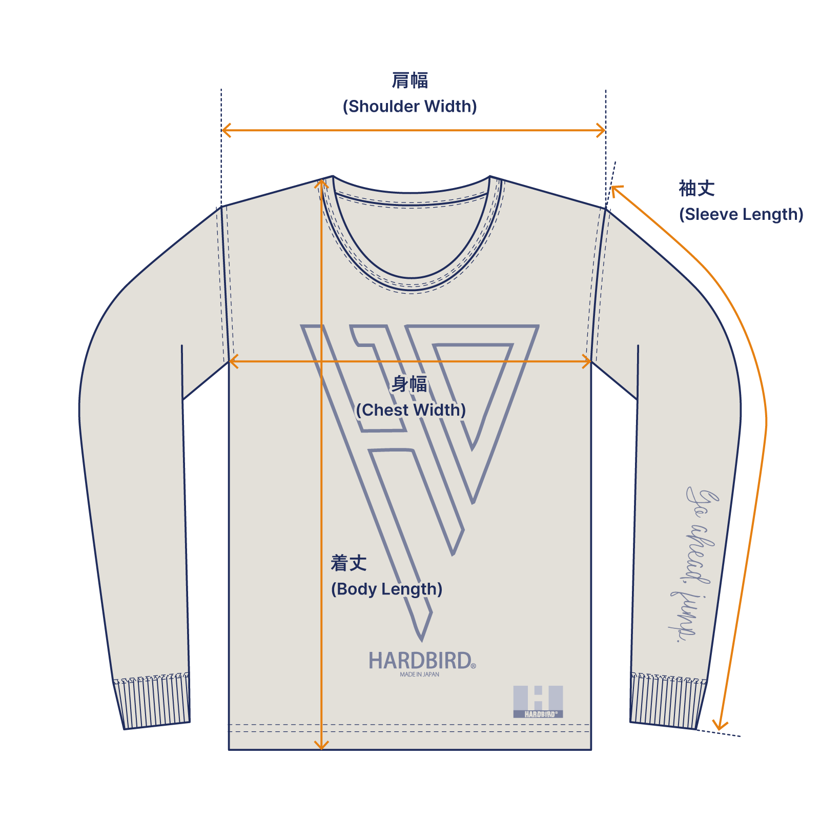 フロントには大きくHARDBIRDのブランドロゴでもある「HD」をプリントしています。 逆三角形の配置が目を惹くデザインですが、左袖の裏側にも「GO AHEAD JUMP」とプリントされています。 「さあ!飛び跳ねよう!」そんなメッセージが込められたデザインは、ラバープリントを採用することでくっきりと存在感のある仕上がりです。