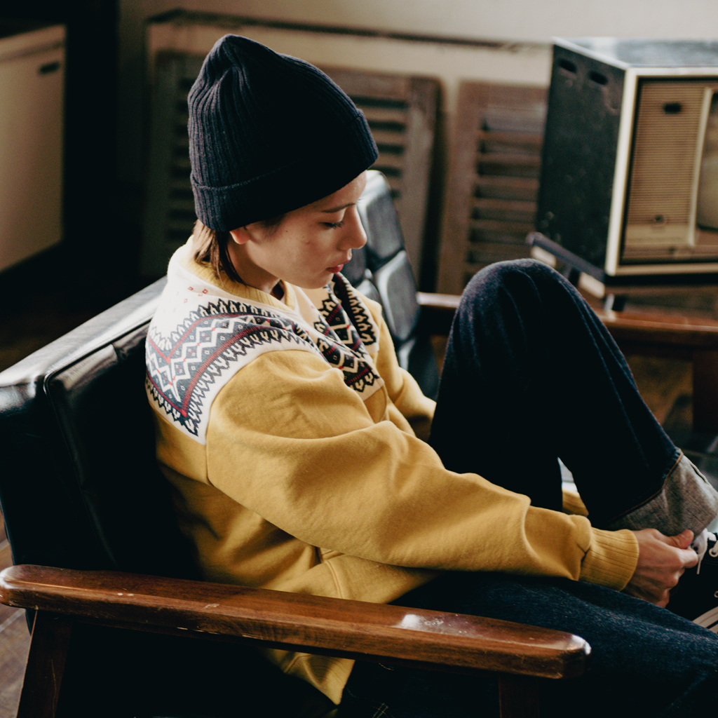 3本の太いコットン糸で縫い上げられた強靭な首元は、長年の着用による伸びや撚れを防ぎ、きれいな形を保ちます。