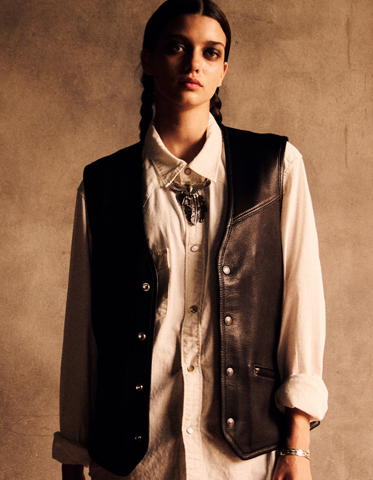 フラットヘッド自社工房ストックバーグ製のディアスキンシャツ、ベストが紹介されています。